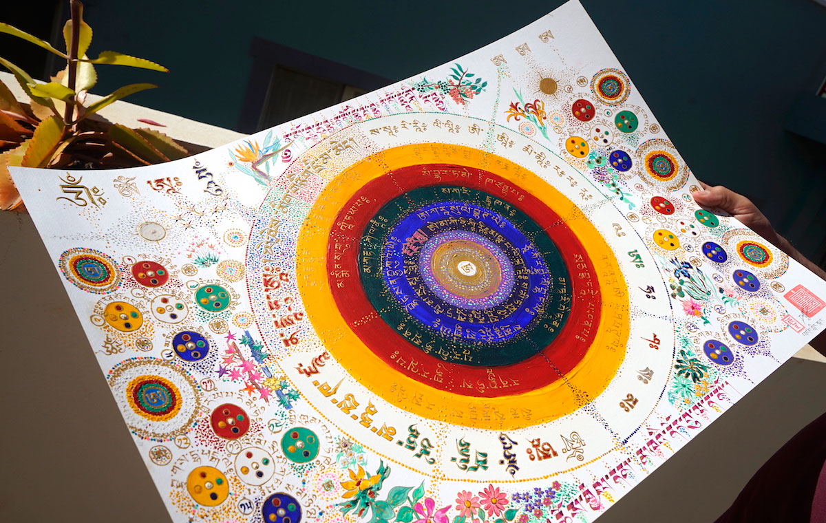 The Song of the Vajra is depicted within a five-colored thigle, which represents the elements in a “friend” relationship, according to Tibetan elemental astrology. The Song of the Vajra concludes with the Six Letters of Liberation, ‘A A HA SHA SA MA, and the mantra of the Peaceful Deities, OM A HUM BODHICITTA MAHA SUKHA JNANA DHATU A.