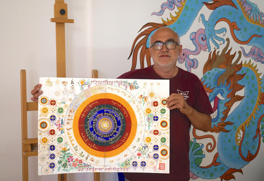 The painting is decorated with many flowers and trees growing in the Dzamling Gardens at the global Gar in Tenerife, such as the bird of paradise, hibiscus, African margheritas and so on.